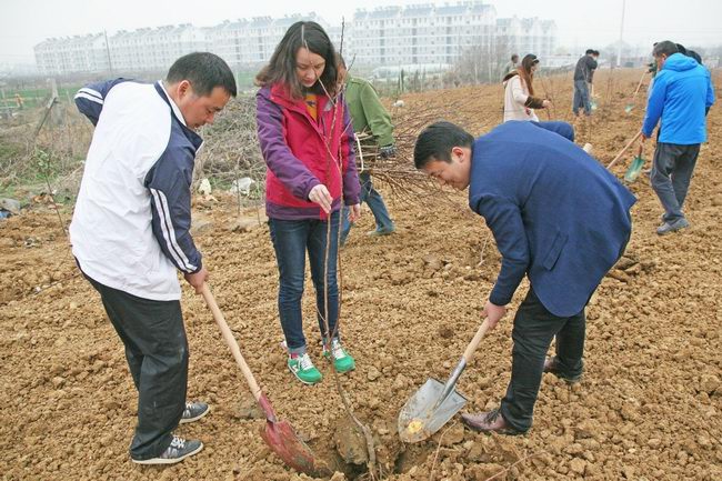 植樹現場,大家分工協(xié)作,揮鍬、挖坑、扶苗、填土,各個環(huán)節(jié)銜接有序,呈現一片熱火朝天的景象。經過兩個多小時的勞動,大家共栽下近兩百顆樹苗。大家希望種下的樹苗能夠茁壯成長,成為蚌埠的空氣凈化器和綠色的風景線