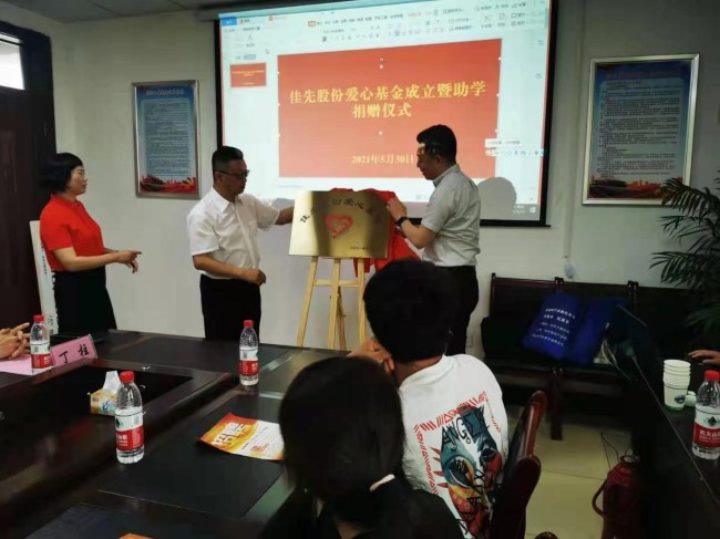 儀式現(xiàn)場(chǎng),佳先股份副總經(jīng)理、工會(huì)主席丁柱介紹了公司發(fā)展及參與公益事業(yè)的情況;區(qū)委常委、常務(wù)副區(qū)長(zhǎng)程旭和佳先股份董事長(zhǎng)李兌共同為“佳先股份愛(ài)心基金”揭牌;佳先股份愛(ài)心基金向沫河口鎮(zhèn)學(xué)生捐贈(zèng)10萬(wàn)元。